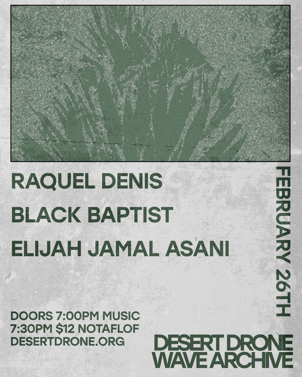 Multi-hypenate artist and educator elijah jamal asani comes to Tucson, and is joined by Raquel Denis and Black Baptist. elijah's latest album on AKP Recordings ",,, as long as i long to memorise your sky ,,,," is a collection of ambient tracks driven by his 2022 residency at the Grand Canyon weaving together tracks of instruments and field recordings.