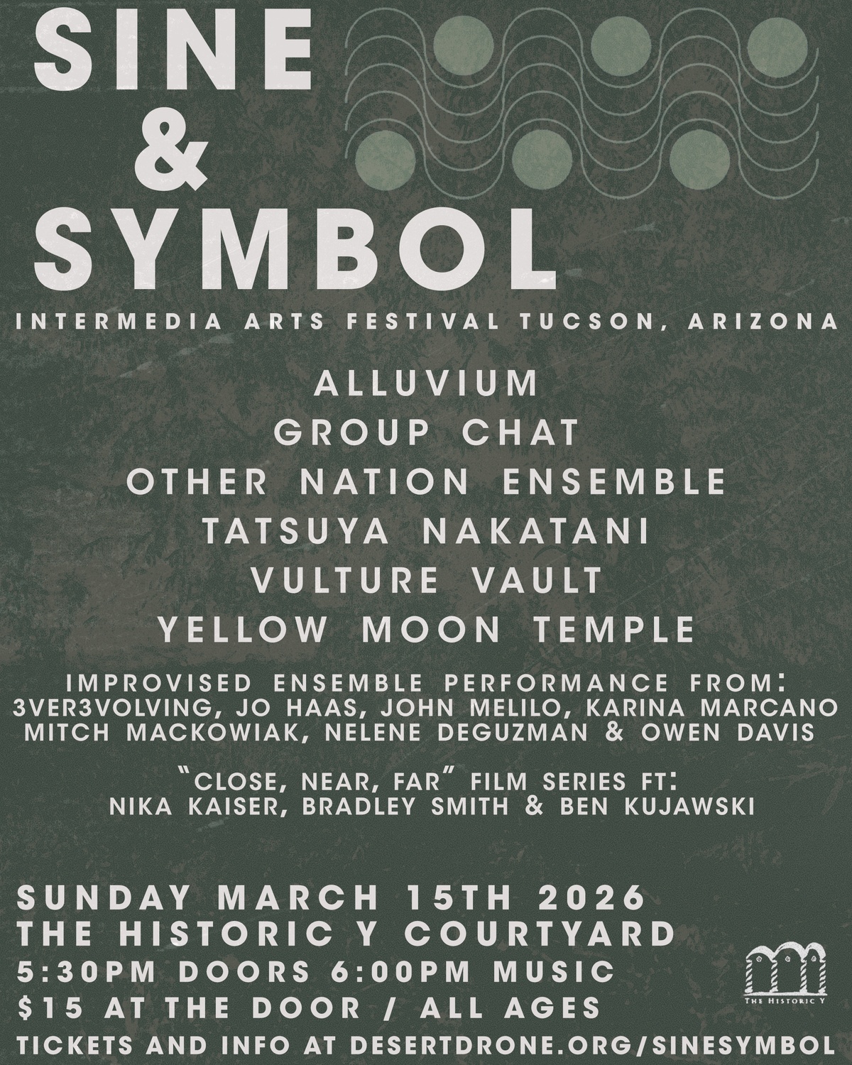 Sunday March 15th at The Historic Y Courtyard: Alluvium / Group Chat / Other Nation Ensemble / Tatsuya Nakatani / Vulture Vault / Yellow Moon Temple. Improvised group ensemble ft: 3ver3volving, Jo Haas, John Melilo, Karina Marcano, Mitchell Mackowiak, Nelene DeGuzman, and Owen Davis. "Close, Near, Far" film series ft: Nika Kaiser, Bradley Smith, & Ben Kujawski for the Sine & Symbol intermedia arts festival. Advance festival pass and full lineups at desertdrone.org/sinesymbol