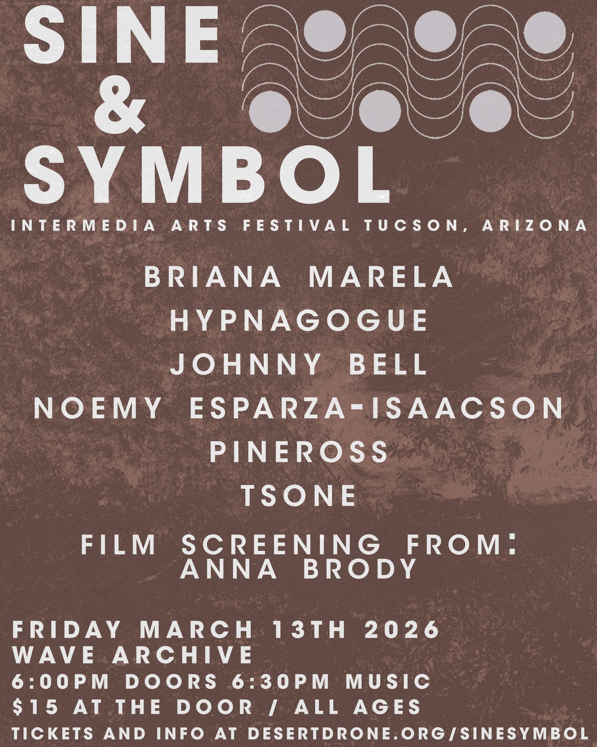 Friday March 13th at Wave Archive: Briana Marela / Hypnagogue / Johnny Bell / Noemy Esparza-Isaacson / Pineross / Tsone, and featuring a film screening from Anna Brody for the Sine & Symbol intermedia arts festival. Advance festival pass and full lineups at desertdrone.org/sinesymbol